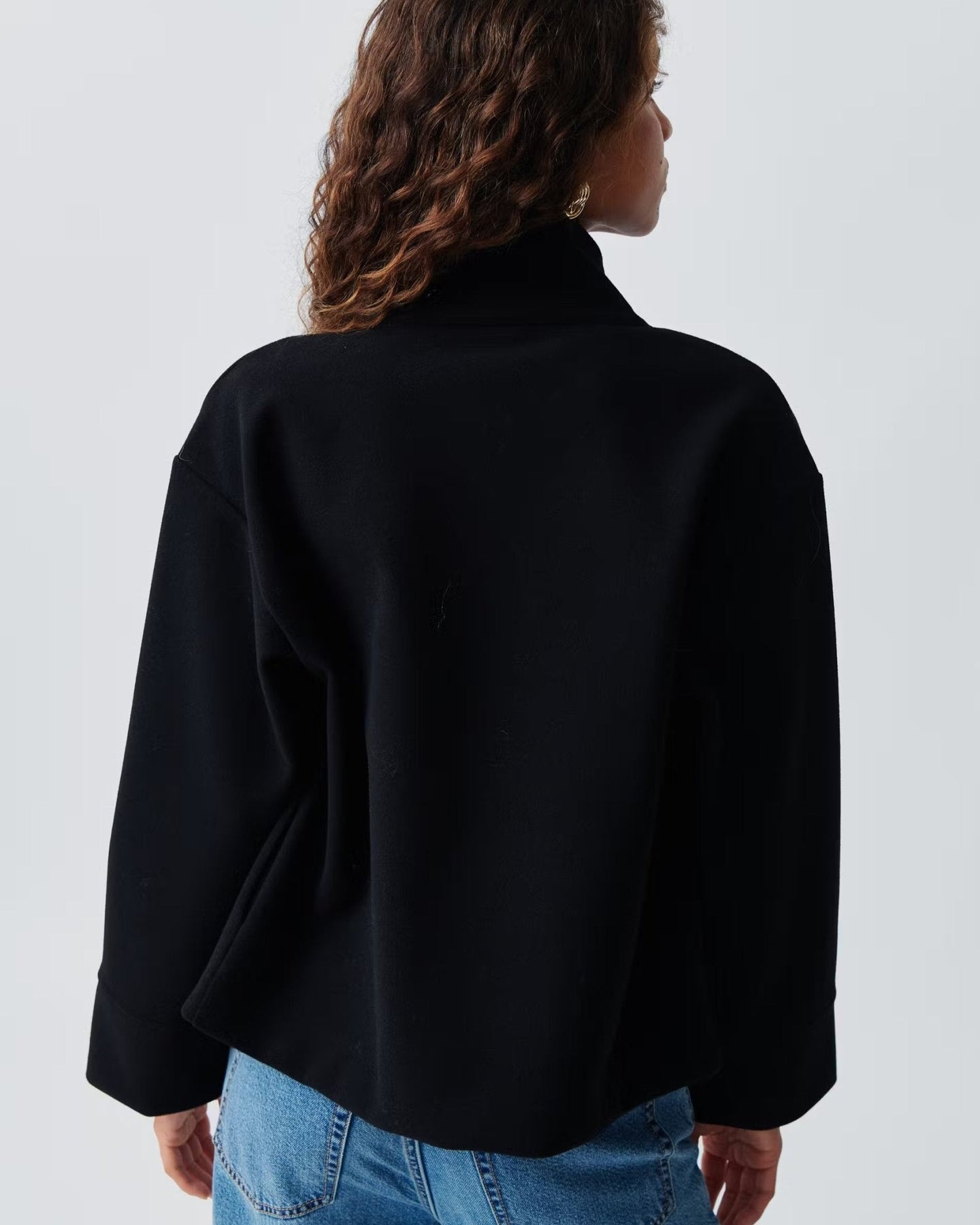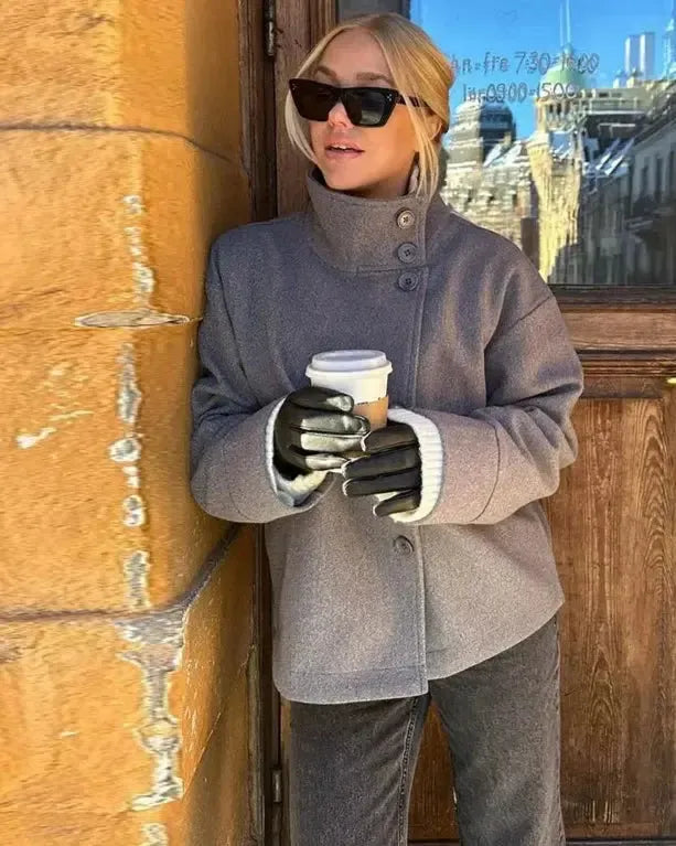 • Nowoczesny design: Krótki model z asymetrycznym zapięciem i dużym kołnierzem