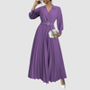 This dress features a flattering V-neckline and long sleeves with cuffs, providing a balanced, sophisticated look. The fitted waist is accentuated by a matching belt with a gold detail, while the full-length pleated skirt adds beautiful movement and elegance. A perfect choice for stylish elegance and everyday comfort.