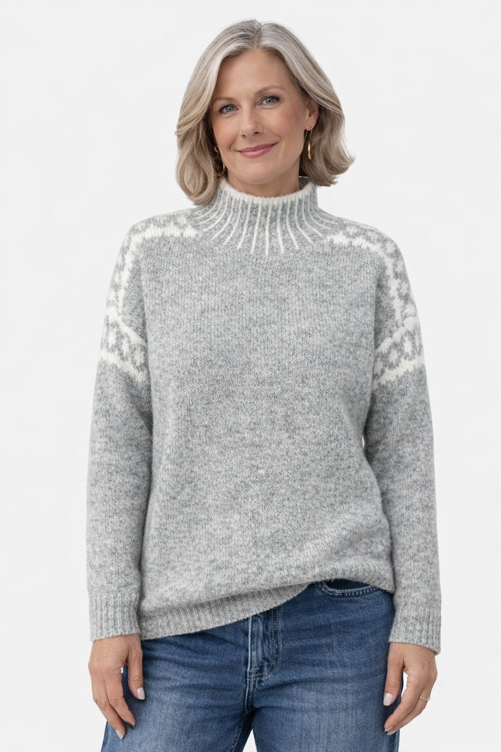 The Livia sweater is perfect for chilly days. The soft knit and high collar keep you comfortably warm, while the Scandinavian print gives it a timeless and wintry look.