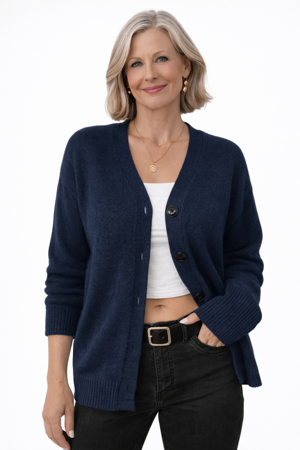 Wyposażony w żebrowane mankiety i dół, sweter oferuje miękką strukturę, a przednia listwa guzikowa pozwala na noszenie go zarówno otwartego, jak i zamkniętego. To sprawia, że jest on wszechstronny i idealny do codziennych stylizacji, zarówno luźnych, jak i eleganckich.