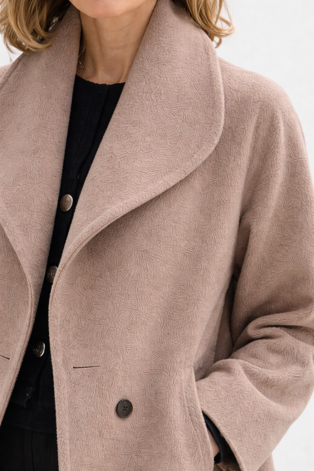 The coat sits comfortably on the shoulders and arms and feels light when worn, while providing warmth where it matters most. A soft collar and timeless design make it suitable for everyday wear as well as more polished occasions. The smooth inner lining allows you to slip it on easily and prevents clothing underneath from catching.