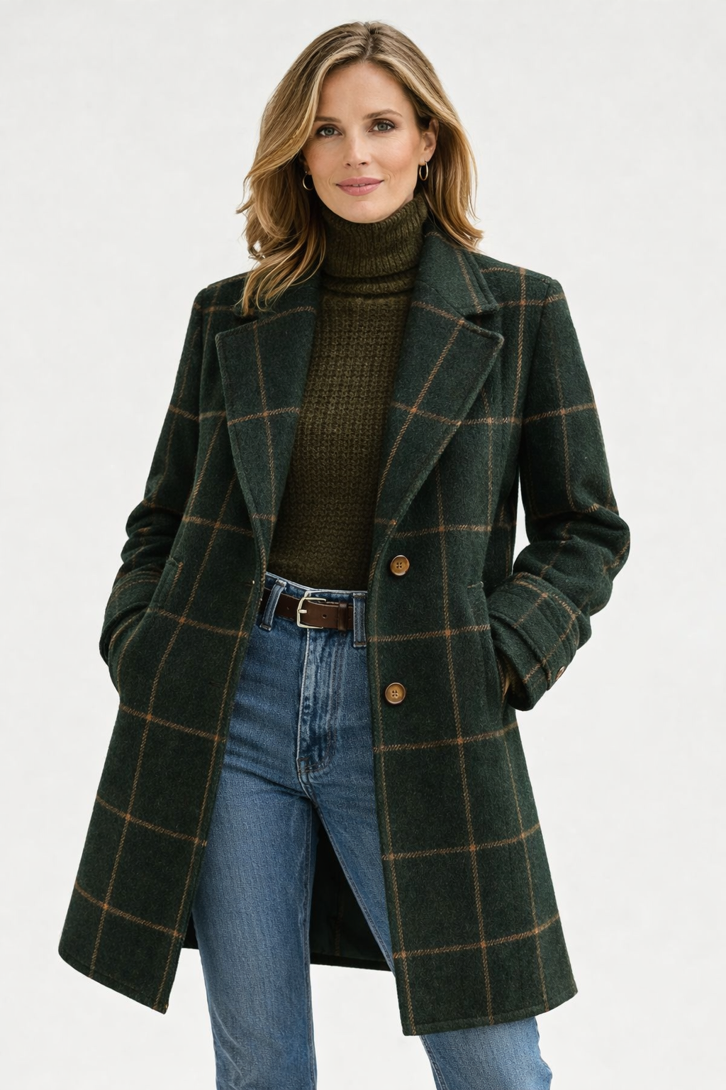 The high-quality fabric provides comfortable warmth and a polished look, while the tailored fit naturally enhances the figure without feeling stiff. The refined plaid pattern and notched lapel add a sense of calm sophistication — that feeling of being perfectly dressed without trying too hard.