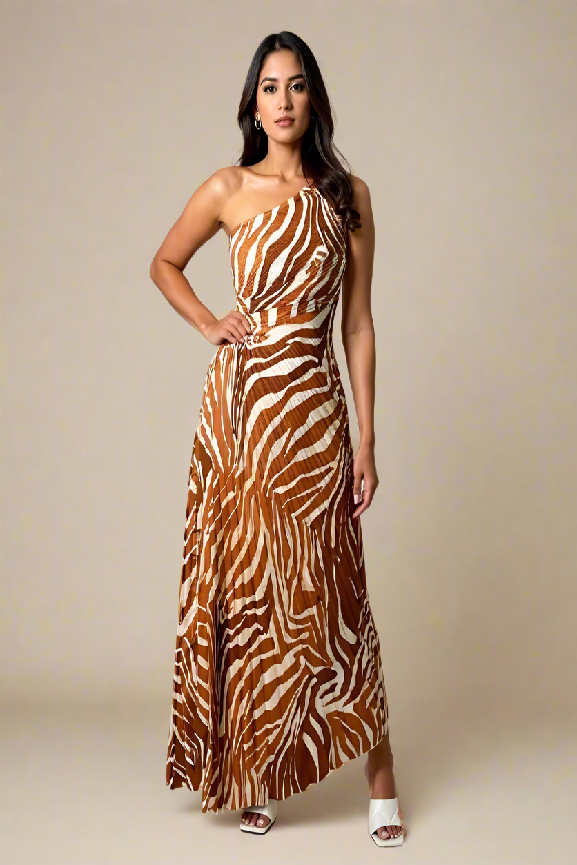 Alva Dress | Pleated One-Shoulder Dress with Zebra Pattern