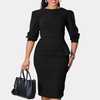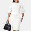 This elegant dress features a fitted silhouette with a peplum ruffle at the waist, accentuating curves and adding a touch of sophistication. The three-quarter length sleeves provide a chic look, while the structured bodice ensures a smooth, body-hugging fit. Designed with just the right amount of coverage and warmth, it’s perfect for the cooler days of fall and winter without compromising on style.