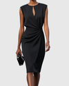 This sleeveless dress features a chic knee-length cut with soft, gathered detailing on the sides that adds shape and elegance. The subtle teardrop neckline at the front introduces a modern touch, while the smooth fabric creates a flattering silhouette. Perfect for everything from casual lunches to evening events, it is a versatile piece that easily transitions through your day.